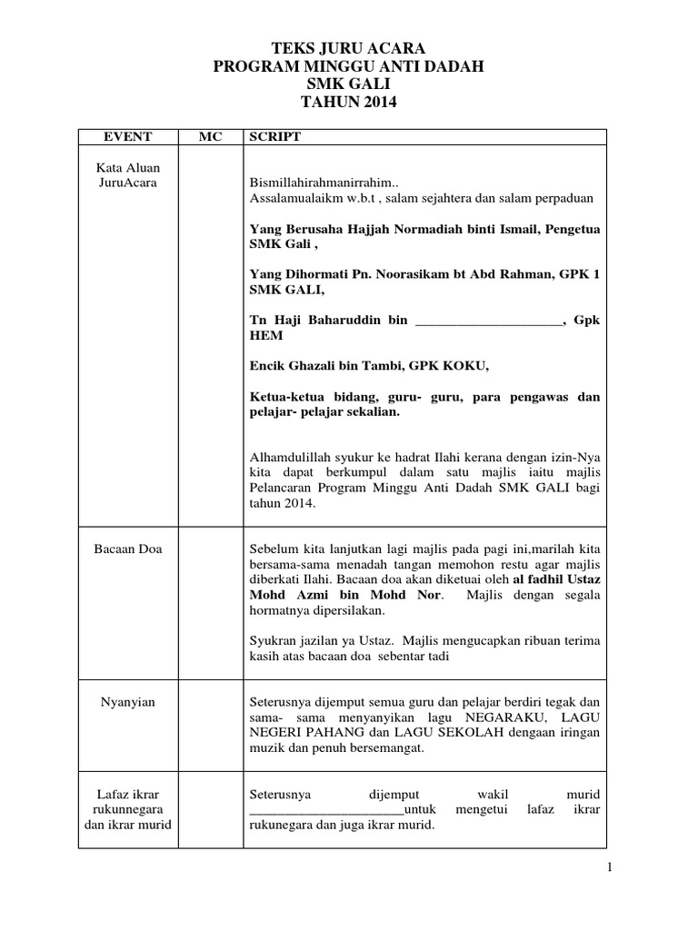 Soalan diolah dalam bentuk. Doa Program Anti Dadah. TEKS PENGACARA MAJLIS ANTI DADAH PERINGKAT SEKOLAH 2012 BIL ATURCARA SKRIP PENGACARA CATATAN 1 Murid-murid berdiri Ke Pekan Kuala membeli bingka Pengacara diminta dalam barisan.