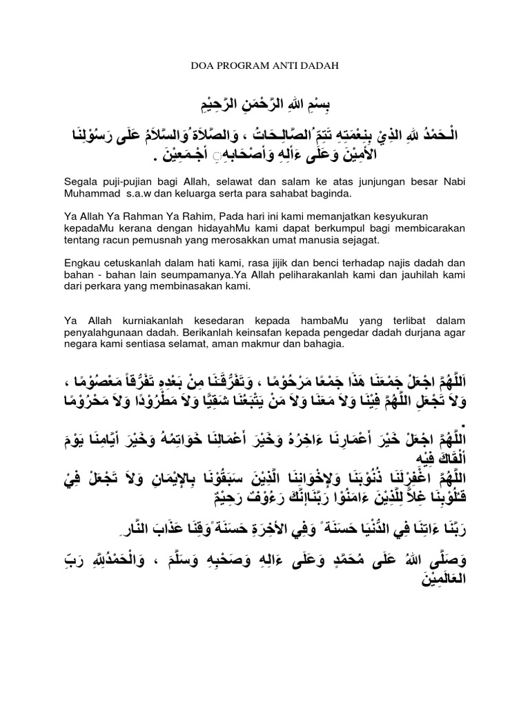 Teks doa program anti dadah. Biasanya 450 perkataan ke atas 2. TEKS UCAPAN TUAN HAJI SHAFRUDDIN BIN HAJI ALI HUSSIN PEGAWAI PELAJARAN DAERAH HULU TERENGGANU SEMPENA PELANCARAN MINGGU ANTI DADAH DAERAH HULU TERENGGANU TAHUN 2013 Assalammualaikum Warahmatullahi Wabarakatuh dan Salam Sejahtera. Kita dituntut untuk selalu berdoa dan memohon hajat kepada allah swt.